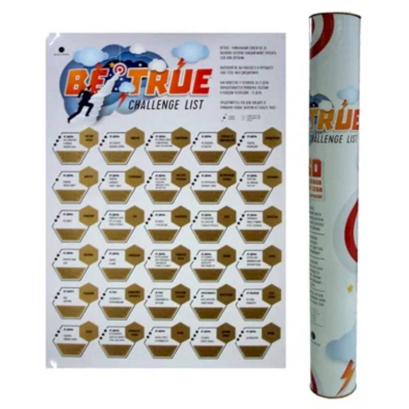 Скетч- плакат 'BE TRUE' - это 30 вызовов для себя и друзей! BE TRUE- уникальный список из 30 вызовов, которые каждый может бросить себе и друзьям. Выполняя их, вы работаете и улучшаете свое тело, ум и дисциплину! Как известно, у человека за 21 день вырабатывается привычка, поэтому в кадом челенджере - 21 день. Продержитесь эти дни, введите в привычку новые занятия и станьте TRUE!
