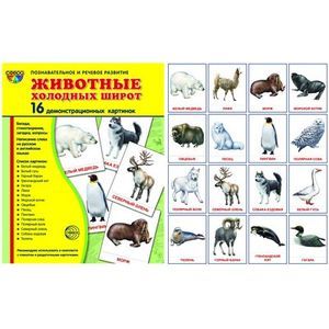 16 демонстрационных картинок: белый медведь, белые гуси, горный баран, гренландский кит, гагара, лама, морж, морской котик, овцебык, песец, пингвины, полярная сова, полярный волк, северный олень, собаки ездовые, тюлень.