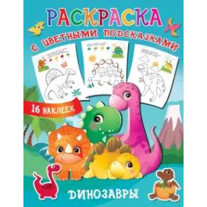 • Замечательная раскраска с наклейками-образцами познакомит с миром динозавров — ребенку предлагается для каждой странички подобрать стикер и аккуратно раскрасить картинку по образцу.