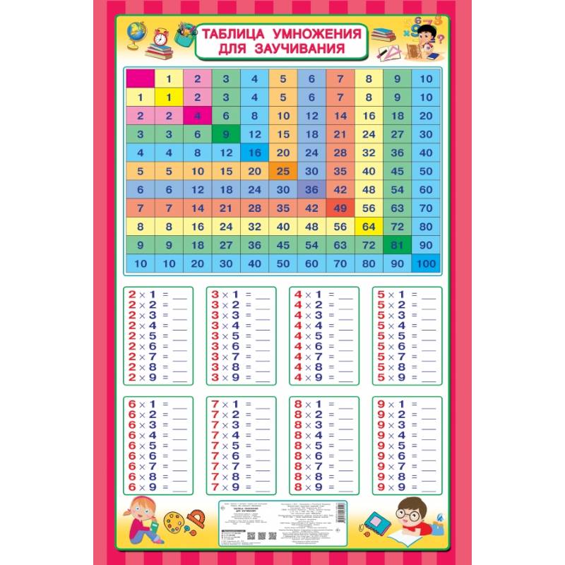 Плакат 'Таблица умножения для заучивания' — прекрасный подарок для любого школьника младших классов. Известно, что самое сложное — выучить наизусть таблицу умножения. Этот плакат поможет без особого труда выучить таблицу умножения. Для этого достаточно повесить его на стену перед рабочим местом ученика: то, что постоянно перед глазами, быстро и легко запоминается. Пособие для заучивания таблицы умножения пригодится любому школьнику.