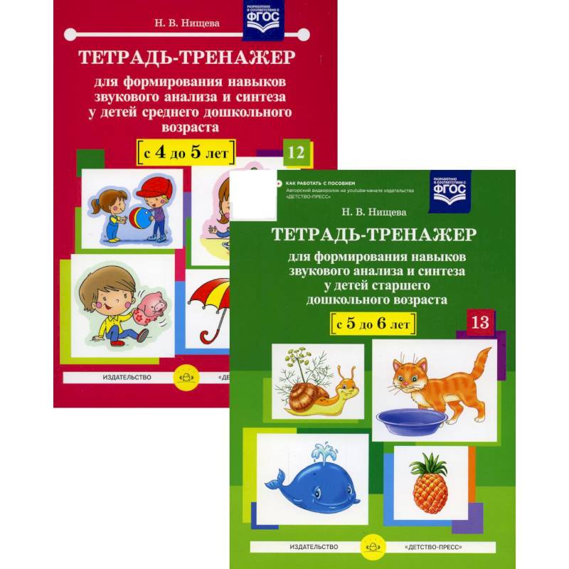 Комплект состоит из двух тетрадей-тренажеров для формирования навыков звукового анализа и синтеза у детей среднего дошкольного возраста (с 4 до 5 лет) и у детей старшего дошкольного возраста (с 5 до 6 лет).