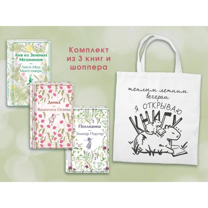 В комплект входят 3 книги — «Аня из Зелёных Мезонинов» Люси Мод Монтгомери, «Динка» Валентины Осеевой, «Поллианна» Элиноры Портер и шоппер «Теплым летним вечером», в нем можно хранить книги и приятные воспоминания.