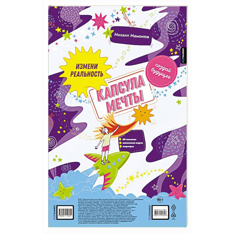 Михаил Мамонтов — психолог и карьерный коуч. Более шестнадцати лет помогает молодым людям глубже понять себя, раскрыть свой потенциал и найти мотивацию. Научит работе с таким мощным инструментом, как карта желаний, который станет твоим личным компасом: поможет осознанно выбрать путь и уверенно идти к своим целям.   «Капсула мечты» — это уникальная система, с помощью которой ты научишься понимать и формулировать свои желания, визулизировать цели, развивать осознанность через анализ разных сфер жизни, планировать будущее; обретешь уверенность в себе и построишь жизнь, о которой всегда мечтал.   Внутри ты найдешь все необходимое для создания своей идеальной реальности:   •  Карта желаний из плотного картона для визуализации глобальных целей и самых заветных желаний.  •  Брошюра с красочными картинками и наклейками, которые помогут тебе сделать карту яркой и индивидуальной.  •  Инструкция и упражнения, помогающие проработать цели, проанализировать прогресс и записать свои мысли. •  Магнитная карта для фиксации небольших, но важных желаний, ведь волшебство начинается с малого! Для того чтобы притянуть крупные цели, важно исполнить хотя бы одну маленькую мечту. Часто мы забываем о таких простых радостях, как поход в кино, обед в кафе или покупка новых кроссовок, а ведь именно они наполняют жизнь яркими красками и дают ощущение, что мечты сбываются. Записывай их на магнитной карте, вычеркивай по мере исполнения и чувствуй магию каждого прожитого дня! •  Два цветных маркера для записи.