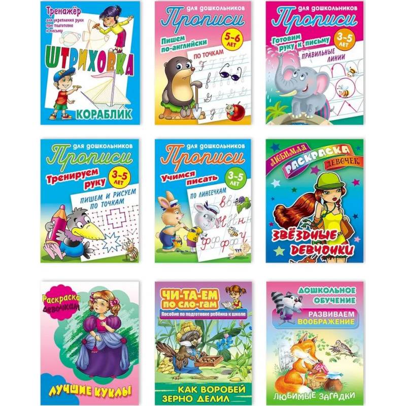Комплект №9: Тренажер для укрепления руки 'Кораблик' (2-е издание), Прописи 'По точкам', 'Правильные линии', 'Пишем и рисуем по точкам', 'Учимся писать по линеечкам', Раскраски 'Звездные девчонки', 'Лучшие куклы', Читаем по слогам 'Как воробей зерно делил', Развиваем воображение 'Загадки-отгадки'.