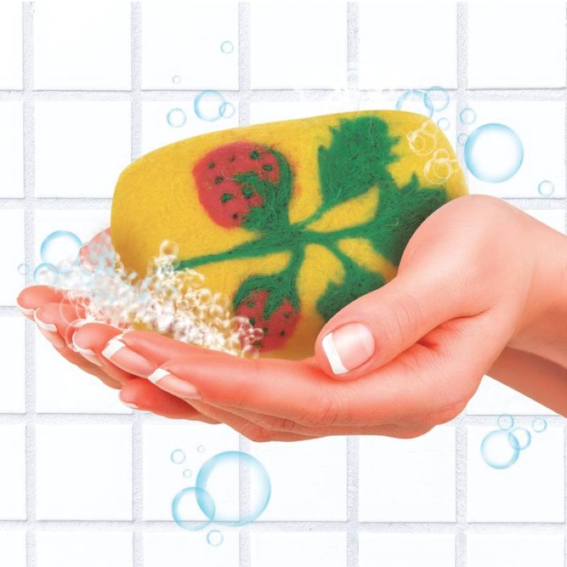 С помощью специальной иглы присоединяйте лоскуты цветной шерсти к мылу-основе и создавайте рисунок по схеме. Как это сделать, подробно описано в инструкции, а также в видео с мастер-классом (QR-код внутри упаковки).