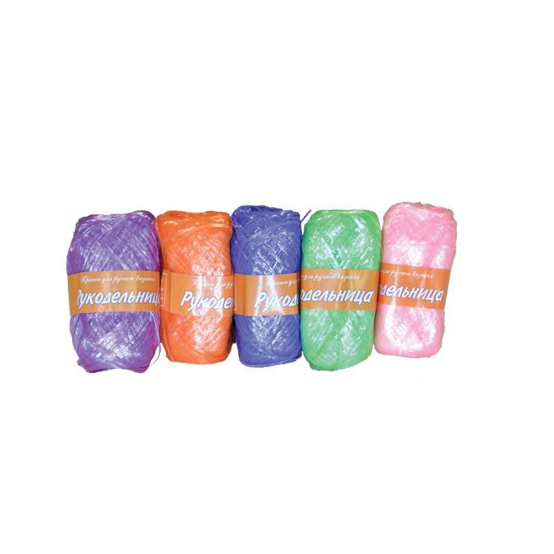 Полипропиленовая нить. Пряжа предназначена для вязания мочалок, пляжных сумок. Вес мотка — 50 г. Упаковка — 5 штук.