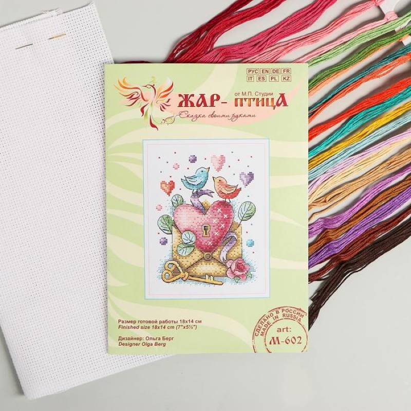 В набор входит: канва Аида №14, нитки мулине 22 цветов, игла, схема и руководство по вышиванию.